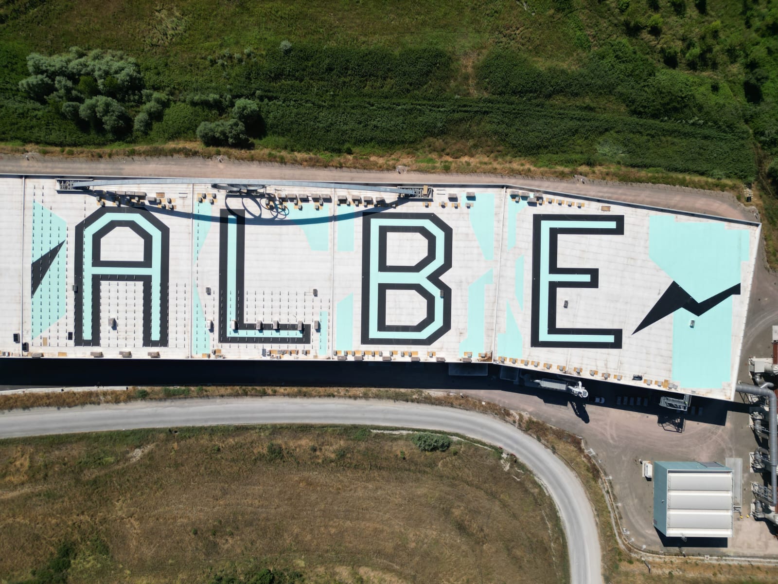 L’intervento è stato realizzato in due fasi, la prima fase, la realizzazione dell’impermeabilizzazione su una superficie di 14.000 mq con manto sintetico in tpo, la seconda fase costituita dalla realizzazione di una “scritta artistica e realizzazione di varie forme geometriche” sul manto precedentemente installato. Per la realizzazione dell’opera è stato installato in doppia colorazione manto sintetico in TPO. L’opera realizzata ha impegnato una superficie di 5.000 mq circa.